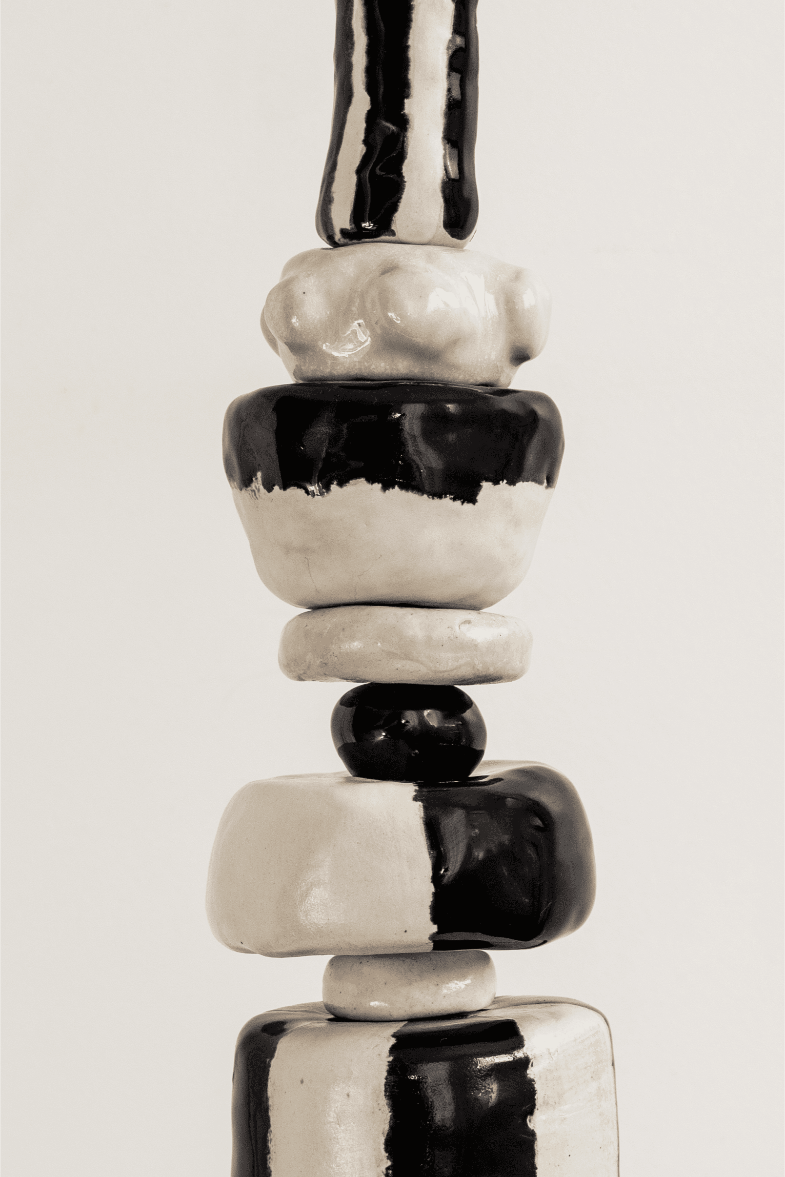 Un trampantojo. Un espectáculo de claroscuro en blanco y negro. La ausencia de color permite un diálogo puro entre la forma y la sombra, la figura y el vacío, resaltando los contornos de la escultura y los espacios negativos.